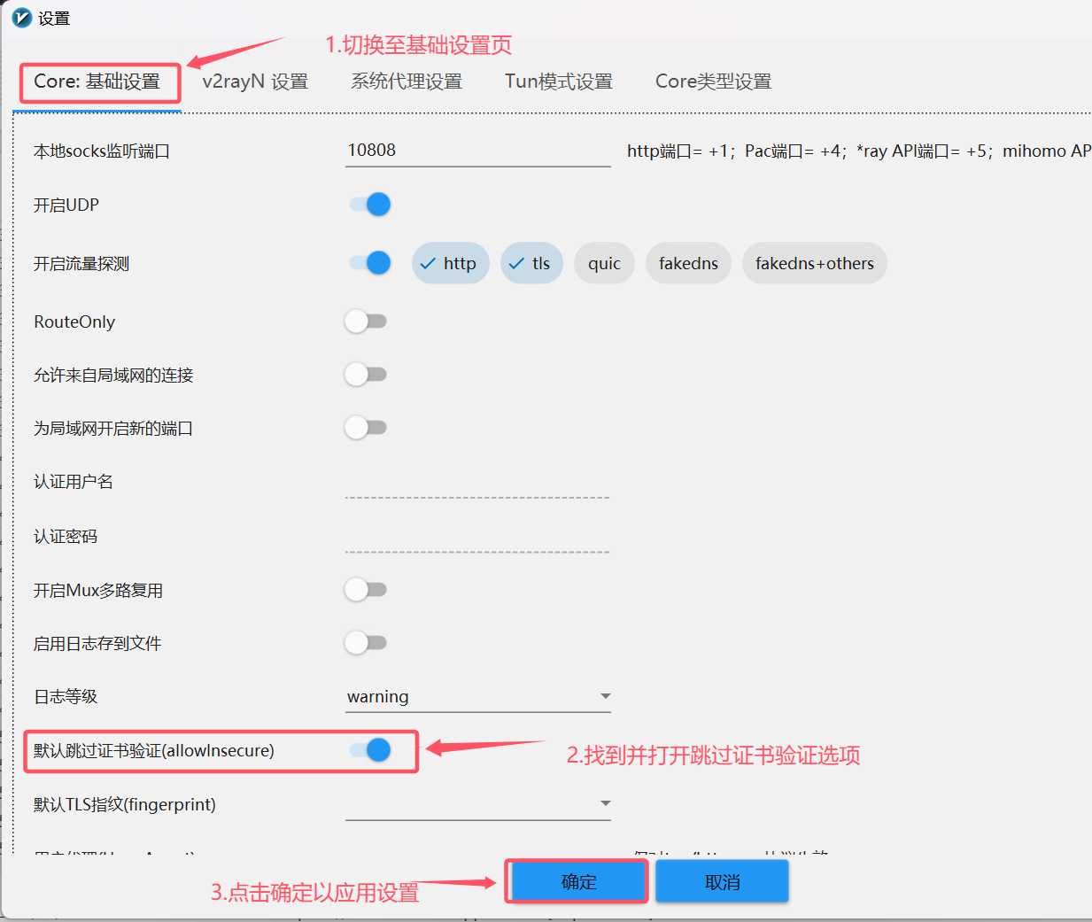 第三步,在新打开的参数设置窗口中,切换至“基础设置”页,然后找到并开启“默认跳过证书验证”项目。点击确定
