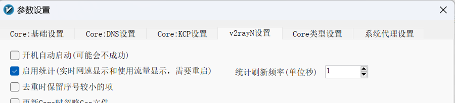 8 如何显示网速统计 在主界面点击参数设置,勾选启用统计,需要重启v2rayN客户端。